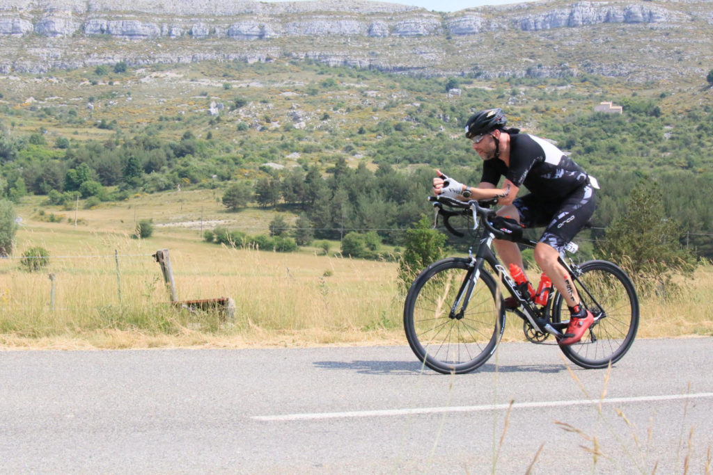 D’abord se taper toute la prom’. C’est plat, idéal pour chauffer les jambes, je roule bien. Il y a beaucoup de cyclistes autour de moi. A l’aller elle passe vite (spoil !). On sort de Nice, passe Saint Laurent. Le premier ravito arrive, je ne m’arrête pas mais change les deux gourdes. Depuis le début je bois beaucoup. On passe devant le camping, chiche je m’arrête la et je retourne me coucher ! Ensuite on monte assez rapidement vers l’arrière-pays. J’ai des bonnes jambes et je double pas mal dans cette première montée. J’hésites a accélérer encore, mais je préfère rester sur un rythme longue distance. On arrive dans des paysages magnifiques, c’est vallonné. Pas difficile mais de quoi y laisser un peu de force. Ravito, je bois encore. J’ai mal au ventre de boire autant d’un coup, mais je suis convaincu que c’est la bonne chose a faire. Et on arrive au pied du col de l’Ecre, on va monter pendant 20 Km. En soit rien de difficile, sauf qu’il fait très chaud. Les secours sont déjà a l’oeuvre, regardent, interrogent le moindre coureur qui semble en difficulté. Je suis rassuré, ils ne me parlent pas, je dois paraître encore frais ! Certains font des pauses sur les quelques points d’ombre, d’autres semble vraiment en difficulté, la chaleur enroule les coureur, par dessus et par réflexion sur la route. En roulant aussi lentement (je ne suis pas un grimpeur !) il n’y a pas d’air du tout. Je bois, bois encore, je fais moins le malin. Des gens que j’ai doublé avant me redoublent. A part compter les Km je n’ai pas de repères sur la distance restante avant le sommet. En plus le parcours ayant été raccourci, notamment au début, les repères kilométriques que j’avais noté se révèlent faussés, donc je suis dans l’inconnu. J’arrive enfin au sommet, Km 64, il en reste 90.