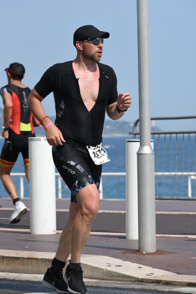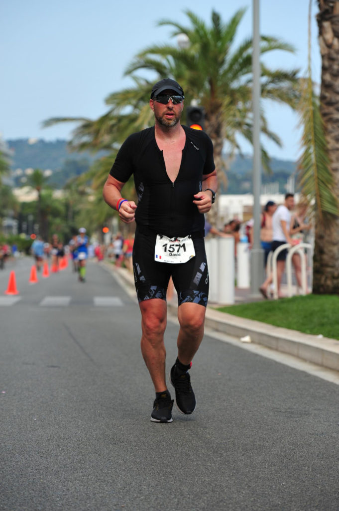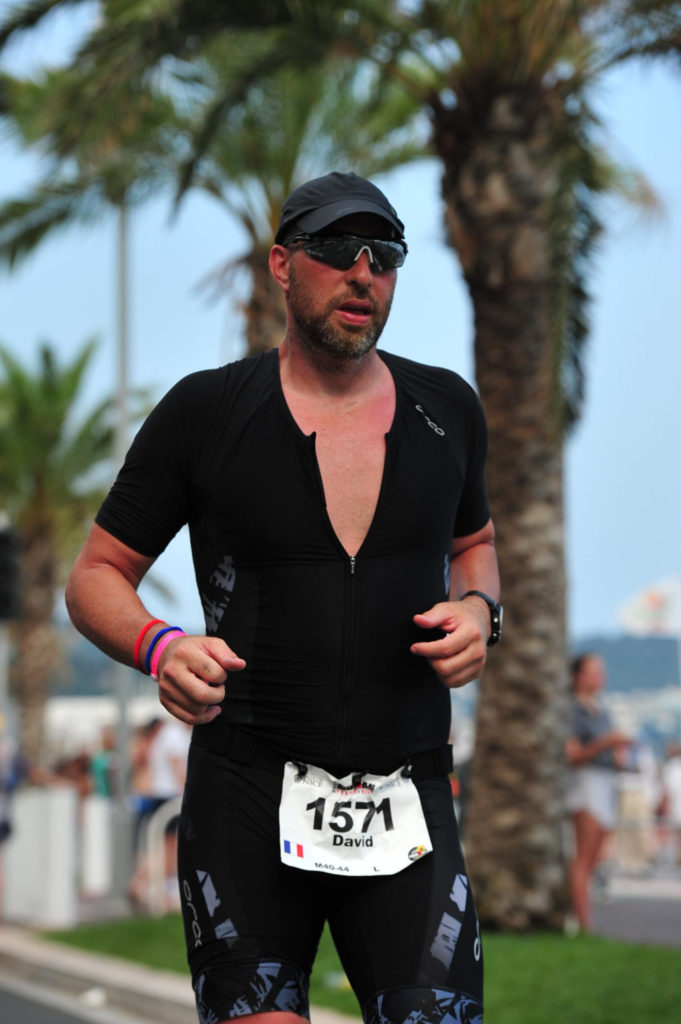 L’orga a prévu un ravito tous les 2km et des arches d’arrosages. Je les ai vu en finissant le vélo, j’ai hâte d’y passer. Par contre un sujet commence a me tourner en tète, je n’ai pas vu mes parents sur tout le vélo, et je ne les ai pas vu sur le début du parcours CAP. Qu’est ce qui leur est arrivé ? Pas le temps de réfléchir, et pas moyen non plus, il y a du bruit autour. Des spectateurs qui encouragent, oui mas pas que. Il y a aussi la sirène des secours. Incessante, je remarque les camions des pompiers et de la sécurité civile qui tournent en permanence, et je prends conscience de toutes les personnes en difficultés, arrêtés sous les arbres, en déshydratation ou simplement au bout. Je suis sur un petit rythme de 11Km/h. Je sais qu’a cette vitesse, je peux tenir longtemps. Je passe sous les arches d’arrosage, bois encore beaucoup, par contre je ne vois toujours pas le demi tour et donc la fin des 5 premiers Km. Quelle est longue cette saloperie de prom’ ! Je passe l’aéroport, et ça y est, je vois les bénévoles qui sont au demi-tour. Je tourne, j’ai un peu de mal a relancer mais ça passe. Je longe maintenant l’aéroport, il fais encore plus chaud qu’avant. Je comprend que les mouvements des avions juste derrière le grillage réchauffe encore l’air ambiant. Je ne pensais pas que c’était possible. J’ai maintenant des repères visuels sur le parcours car je me refuse a regarder le décompte des Kms a la montre. Même technique qu’a Embrun, je compte les tours. 3 tours c’est moins déprimant que 30Km ! Je longe maintenant la plage toujours sur mon petit rythme de croisière et arrive derrière deux géants qui marchent. Autour d’eux tout le monde a l’air encore plus enthousiasmé. Un des deux, 2m, blond des épaules gigantesques et tatouées mais des jambes anormalement fines pour un triathlète. D’ailleurs ils marchent, traînant leurs grandes carcasse sous la chaleur. Je double et comprend l’excitation des spectateurs, c’est Camille Lacourt. Intérieurement et presque méchamment, je prend plaisir a le doubler. Il fait moins le mariole le champion olympique ! Au ravitaillement il n’y en a que pour lui, mais son visage est marqué, fatigué, mais globalement comme tout le monde autour. Je me rapproche de la fin du tour et donc de l’arche d’arrivée que je vais éviter deux fois. Et je commence a entendre le speaker. A chaque participant qui passe la ligne le speaker cite son nom suivi de la phrase magique « You are an IronMan ». Et ce speaker, cette phrase me mettent un magistral coup de fouet. Je n’avais pas prévu d’abandonner mais maintenant ça deviens impossible. Je veux ça. Je veux ma photo sous la mythique arche rouge et noire. Je veux devenir un IronMan. Je passe a coté de l’arche, prends mon bracelet synonyme de fin de premier tour, demi tour je repars dans l’autre sens.