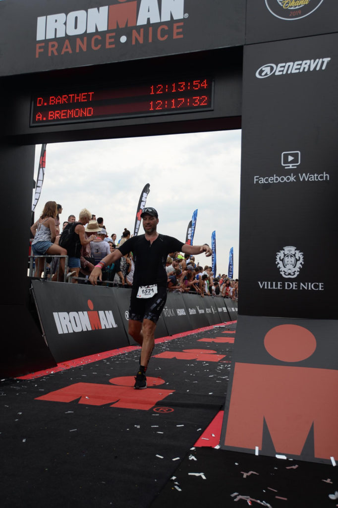 Demi-tour reste 5km. Je suis presque euphorique d’être aussi prêt du but. Devoir boire lentement me sert de prétexte pour discuter et remercier les bénévoles aux ravitaillements. Je regarde avec pitié les coureurs qui n’ont pas encore leurs deux bracelets et qui vont continuer. Je me rapproche de l’arrivée. Vu le rythme du speaker il y a beaucoup de monde qui en termine maintenant. Je vois mes parents une centaine de mètres avant l’arche. Bah oui beaucoup de participants signifie beaucoup de fans et donc difficile de se rapprocher de l’aire d’arrivée. J’arrive maintenant sur la moquette rouge et noir, il y a du bruit, des gens qui tapent sur les barrières, j’ai quasiment envie de rester la, tranquillement, a apprécier ce moment. Le speaker commence a dire mon nom, je passe l’arche au son de « You are an IronMaaaan ». Je lève les yeux sur l’arche, mon nom a coté de mon temps : 12H13. Encore une fois cette impression bizarre d’avoir « déjà » fini. Ce moment, cette arche rouge et noire je l’ai attendue, rêvée. Et voila c’est fait après « a peine » 12H d’efforts. Presque trop facile. C’est vrai qu’après tout : ce n’est pas Embrun !