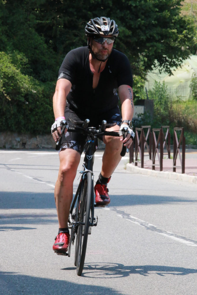 Arrivée en haut il faut avancer vers le parc…non pas vers le parc, mais vers l’aire de transition. Et oui ce n’est pas comme ailleurs ! Arrêt donc dans l’aire de transition il y a du monde, je ne suis pas trop a la rue. Je prend mon sac T1, sors mes affaires de vélo. Un membre de l’organisation rappelle les règles, il faut remettre la combi dans le sac T1 et jeter le sac dans les grands bacs derrière les chaises. Heureusement qu’il est la car sa voix est un vrai repère. Entre le stress de la course, la perte de repères liée a la natation et l’agitation ambiante, on a vite fait d’oublier quelque chose. Un autre membre de l’orga est la pour passer de la crème solaire sur la nuque. Pas de refus, le soleil tape déjà fort. Prêt pour le vélo, je jette mon sac T1 et me dirige vers le parc a vélo, arrêt a la table rafraîchissement. Même si je n’ai pas soif sur l’instant je sais que je dois boire…beaucoup. Je me dirige vers mon slot, prend le vélo sors du parc et go.