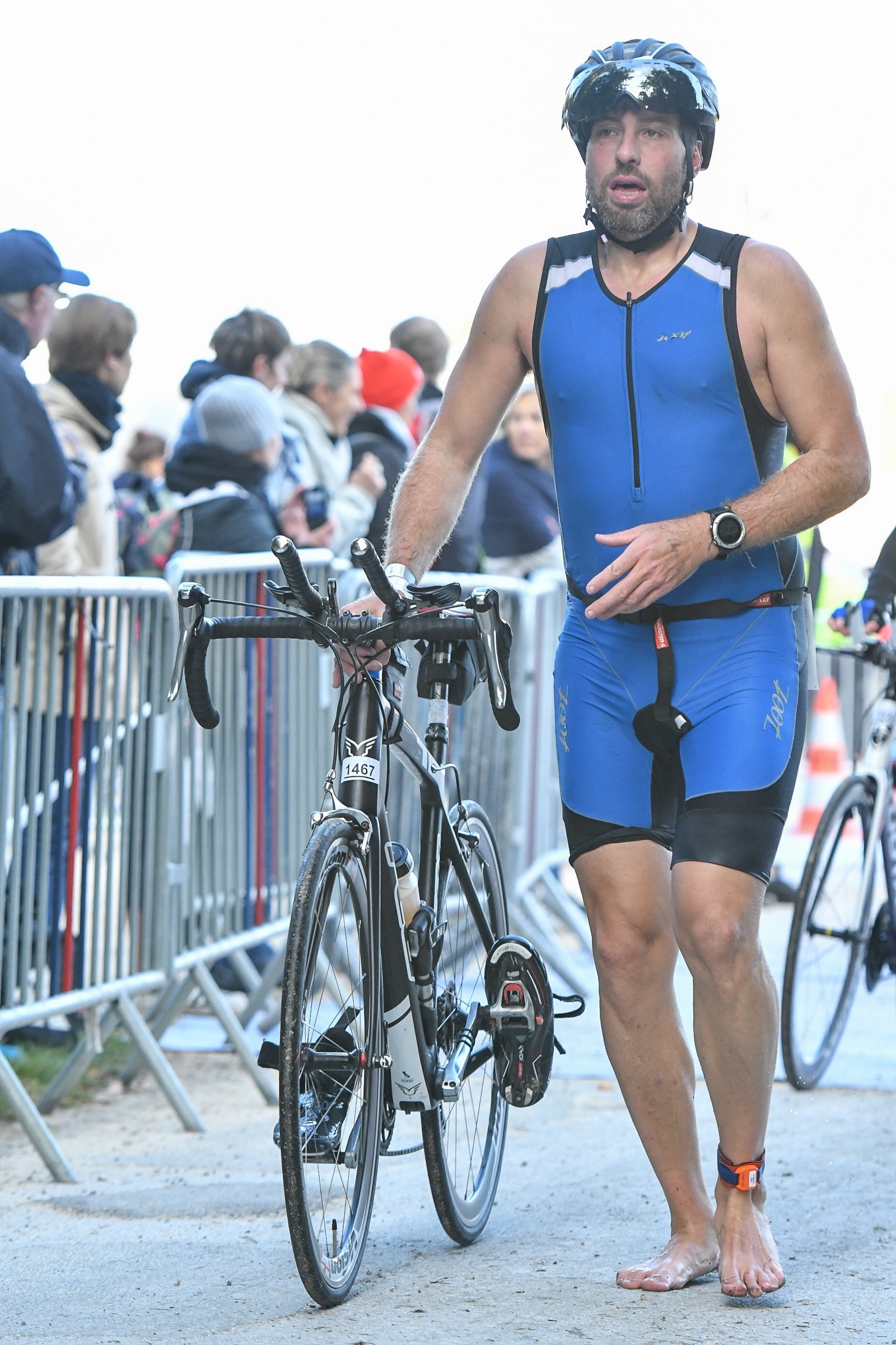La particularité du parcours vélo, et une des seules difficultés, est la sortie du parc du château sur du chemin caillouteux. 1 Km a parcourir ou ça tape dans les bras, c’est instable, et j’ai très peur de crever juste au départ. Ça se passe bien, je rejoins la route et j’appuie. J’ai de suite de très bonne sensations, je reprends vite du monde. Il y a aussi beaucoup de cyclotouristes qui font leurs sorties dominicales et qui se demandent d’ou viennent ces avions qui doublent a tout va. Car oui, avec presque 500 dossards (individuels + relais), ça fait du monde sur la route. Je continue de remonter, de doubler, ça me blinde le mental. Je sais que je vais vite, mais je ne veux pas regarder la montre. La première boucle de 45 km avance vite. Les ravitaillements se passent bien. Il est encore tôt, mais je bois beaucoup et mange un peu. Suite a Deauville, j’ai changé de stratégie, je ne mange que des compotes et des bananes. On roule sur de grandes lignes droites, plates, ça envoie du gros. On arrive a la fin du premier tour, je ravitaille a 35Kmh, sur ma gauche des cyclistes sortent du parc du château, ce sont les participants du courte distance qui sont partis après nous. Je ne me déconcentre pas, car entre le ravito, les ralentisseurs, les autres vélos et les spectateurs, je me dis que c’est chaud ! Le temps d’y penser que le coureur devant moi claque un ralentisseur et s’envole. Je passe a coté pendant que lui et son vélo retombent. J’entends les bruit froid du vélo sur le béton et le bruit sourd de l’homme claquer sur le sol. Je freine, regarde, je vois des gens courir sur lui, comme on est juste a la sortie du parc, il y a un camion de la sécurité civile qui est la. Je roule en me demandant si j’aurais pu faire quelque chose, mais non, il y avait du monde certainement plus qualifié que moi. Je relance m’éloigne du château pour retomber sur la départementale. Il y a beaucoup de monde sur la ligne droite devant moi. Les dossards rouges (courte distance) se sont mêlés aux dossards blancs (longue distance). Intérieurement je souris. Je doublais déjà beaucoup quand il n’y avait que les blancs, maintenant ça va être la boucherie. Et effectivement ca été 40 Km de zigzag pour doubler des vélos. Plus je doublais, plus je me sentais bien, plus j’allais vite. Un tel état d’euphorie que même les secteurs pavés ne m’ont pas ralentis. Bien calé sur mon 52×13 (les cyclistes comprendront), a l’aise sur les prolongateurs, je passe tout a fond. Les faux plats, les virages, les ronds-points, les voitures suiveuses (!). C’était tellement rapide que je suis presque déçu quand je vois que l’on se rapproche de Chantilly. Je ralentis un poil, histoire de reposer un peu les jambes. Retour sur le chemin dans le parc du château. Transition efficace (travaillée aussi pendant les vacances). Il n’y a pas beaucoup de vélo dans le parc. Je suis placé dans le premier tiers. Je regarde la montre avant d’arrêter le chrono vélo : 2H37 au 90Km. Bien sur je suis encore loin des pros, mais c’est mon nouveau record sur un tri. Je pose le vélo, regarde mon slot. Chaussettes ou pas ? je jauge le temps, assez chaud pour ne pas avoir froid, assez froid pour ne pas trop transpirer, je chausse les runnings pieds nus. Bandana sur la tète, je ressors du parc pour 21Km de course…GO !