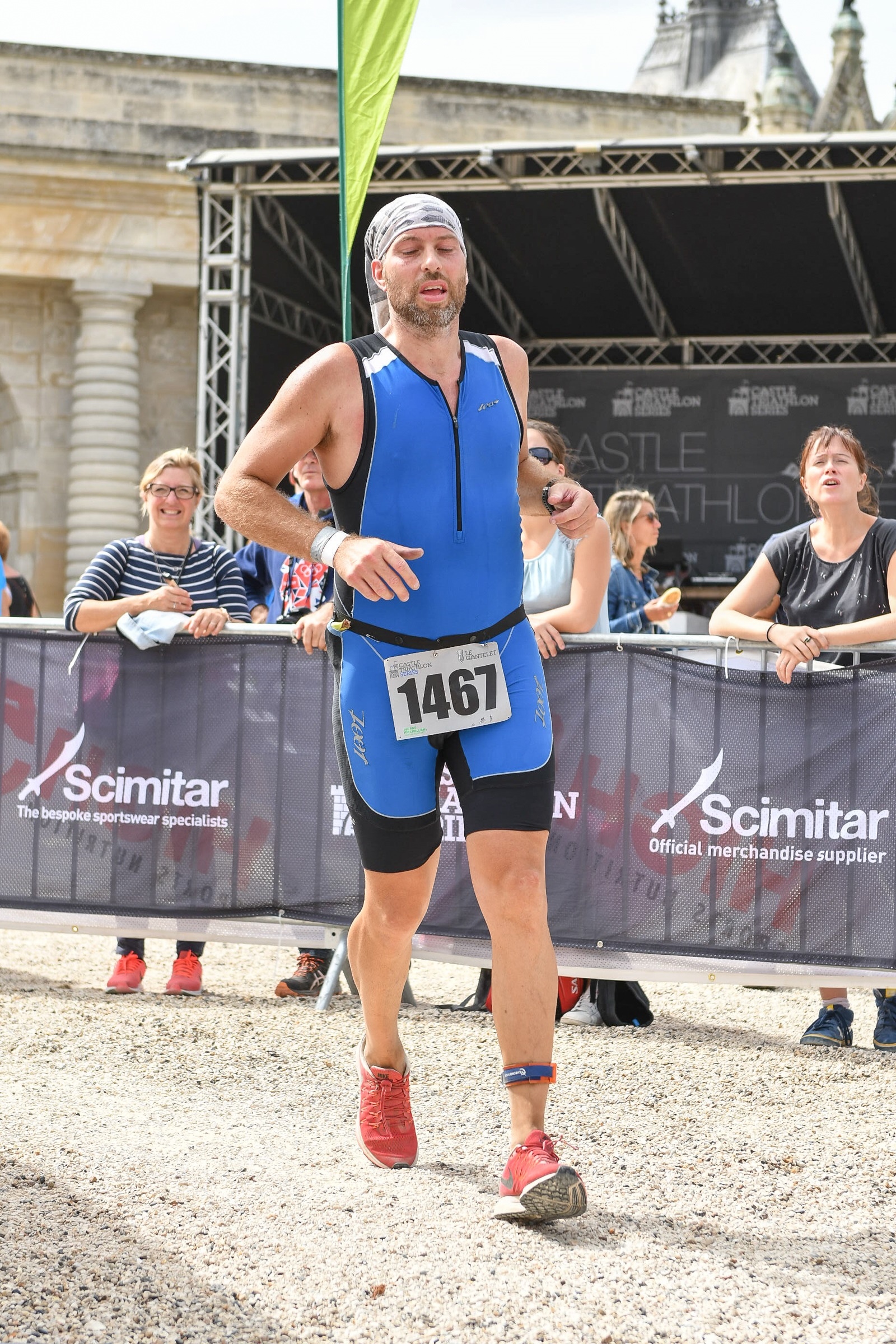 L’euphorie du vélo dure encore un peu, mais je redescends vite sur terre. Sur mes jambes, je sens mon poids, surtout en début de parcours qui se passe dans la foret. Je ne rebondis pas sur ce sol terreux. Je me cale sur un 11Km/H et attends du sol plus dur et moins accidenté. Je sais aussi que Sandra et les enfants doivent venir avec Alain et Lilianne. Je ne sais pas si je les verrais sur le premier ou sur le second tour, mais je devrais les voir. Je divague un peu le temps d’arriver au premier ravito. Même règles que sur le vélo : pas de gel, que de la banane et de la boisson iso. On sort des bois pour arriver sur l’Hippodrome. Il ne fait pas trop chaud (merci le départ a 7H!). Et la c’est un des moments les plus difficile mentalement de la course. Il faut faire le tour de l’hippodrome soit deux longues lignes droites de presque 3Km chacune. C’est monotone, on ne se voit pas avancer. Finalement j’en sors, prend mon deuxième ravitaillement, passe le musée du cheval avant de tourner vers le parc du château. Je rentre dans le parc, et la juste après un virage, je vois la famille. Je vois qu’ils hésitent en me voyant, je ne suis pas sur qu’ils m’aient reconnu tout de suite ! Je m’arrête pour les embrasser. Clement va me suivre un peu dans le parc. Apres 500 m je lui demande de faire demi-tour pour retourner avec Sandra. Je continue. Je suis fatigué mais sur-motivé. Je reviens sur le château, passe devant le bassin, et regarde le chemin pour rejoindre le second tour…ah merde il faut remonter la même qu’a la fin de la natation (logique me direz-vous). On ne passe pas par les escaliers, mais la pente casse quand même les pattes. Je commence le second tour, je vois des participants arriver en vélo. Cela fait déjà 50mn que je cours, je me dis qu’ils ne sont pas prêts de finir. Égoïstement ça me fait du bien ! Je prends le ravito et repars dans la foret. Je profite de l’ombre pour récupérer un peu, mais je me maintiens sur ma vitesse. Je reviens sur l’hippodrome. Avec la fatigue le deuxième passage est vraiment interminable. Il y a encore du monde sur le chemin. Il y a les triathlètes des deux distances, et aussi un 10K et un 21K de course a pieds. Je suis moins impérial que sur le vélo, mais je me défends. Je repars dans mes pensées pendant le retour vers le château. Je réfléchis au temps. Je ne connais pas mon temps de nat, mais je pense que je vais pouvoir approcher les 5H30. Apres Deauville, rien que d’y penser ça me fait du bien. Le temps de sortir de mes rêveries que je reviens dans le parc du château, il me reste 2 Km. Coucou la famille. Clement et Léa se lancent a ma poursuite. Je glisse un mot : RV a l’arrivée. Je rejoins le bassin avec Clement sur les talons, Léa a lâche l’affaire. J’accélère un peu en apercevant le château, je devine l’arche d’arrivée, entends le speaker annoncer les noms des finishers. L’arrivée est un escargot autour des fontaines, des escaliers. Des barrières sont placées pour ne laisser qu’un couloir, des spectateurs sont massés tout autour. Ça encourage fort. Je tourne, tourne et au détour d’un virage, passe l’arche, comme ça, sans même l’avoir vue venir !