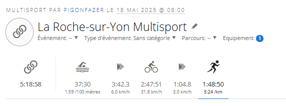 C’est parti pour un week-end de sortie club le 17 mai à La Roche Sur Yon. Faire un half-iron 3 semaines avant le full était un choix difficile. En effet, impossible de placer un cycle entre les deux courses. Je devrais donc gérer la récupération de La Roche, la fin de la prépa et le début de l’affutage sur un temps très court.