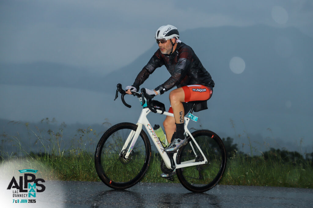 Obnubilé par le départ du parcours vélo, je monte sur le vélo avant la sortie du parc et me fais engeuler par les arbitres. Je redescends, recours et remonte après la ligne. Go pour 180 Km de plaisir. Au menu une première ascension vers le col du Semnoz (25 Km) puis 2 boucles d’un parcours agrémenté de 2 cols moins haut. J’ai fait une croix sur l’espoir de rouler sans pluie. Je m’éloigne du lac pour entrer puis ressortir de la ville de St Jorrioz, sur le parcours reconnu la veille. Je double quelques concurrents dans la montée du Semnoz. Plus je monte, plus l’horizon est bouché. On monte littéralement dans les nuages. Je monte plus ou moins tranquillement vers le Semnoz. On est un petit groupe de 3-4 coureurs qui nous retrouvons au grès des coup de boost de chacun. Ce qui nous permet de remonter un peu dans le classement. Je ne sais pas si je pourrais les garder toute la course. Des fois leur présence me motive, des fois elle m’énerve. Ca m’énerve quand je mets un coup d’accélération de prendre quelques centaines de mètres d’avance et de les voir revenir quelques kilomètres plus loin. Mais dans un sens cela m’amuse de constater que même si on ne joue clairement pas le classement, l’esprit de compet reste présent.