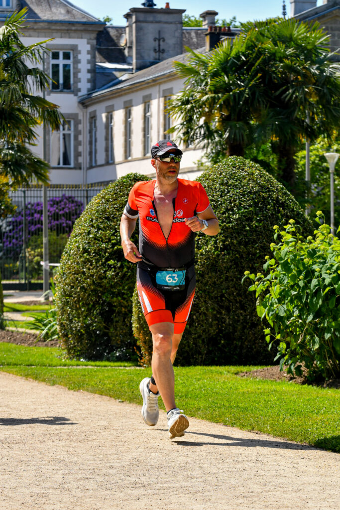 Sur la course à pieds, il fait encore un peu plus chaud, mais en ville, il n’y a pas de vent. Je pars sur un rythme moyen de 5’40/Km le temps de découvrir la boucle de 5 Km. Les ravitaillements sont bien placés pour agrémenter la course. Il y a quelques passages plus durs (une ou deux montées et un escalier) mais le parcours reste assez roulant. Il y a beaucoup de monde sur la place principale de la ville qui héberge le village de l’épreuve et sur laquelle on va passer 4 fois. Sur la première boucle on est nombreux puisqu’on court aussi avec les participants des autres distances. Je cherche un peu l’ombre dans les rues afin de ne pas trop chauffer. Courir en boucle permet aussi de voir les autres membres du club et de de jauger un peu. J’en double certains en ayant un voir 2 tours d’avance sur eux et cours après un autre que j’aperçois de temps en temps quand nos routes se rejoignent. Il a quelques longueurs d’avance. Ce qui est cool car c’est un des meilleurs du club. Je le pensais beaucoup plus en avance. Donc j’accélère autour de 5’30/Km. Je me sens bien. Je ne ralentis pas aux ravitaillements. Je prend juste un verre d’eau en passant. J’en bois la moitié, m’arrose avec le reste. Pas de fringale, le plan se déroule bien. La fin de la course est plus calme. Les courtes distances sont partis, avec leurs supporters, et je profite des moments silencieux pour faire un état des lieux. Je me sens bien. Pas de fatigue excessive, aucune douleur, c’est presque trop facile ! J’accélère. Je finit la course assez propre. Les vitesses ont été respectées et je ne me suis pas cramé. Les collègues et la montre avaient raison, la forme est là. Place a un peu de recup.