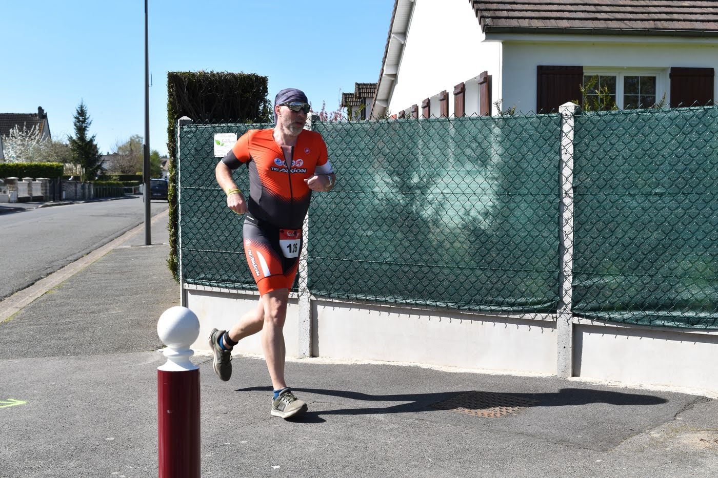 J’arrive enfin au parc, la descente du vélo est douloureuse. Je pose le vélo, retire les chaussures a cales et file pieds nus vers l’aire de transition. Je prends le temps. Pas de massage ici contrairement a Embrun. Par contre, comme a Embrun les premiers on déjà fini. J’entends que Van Lierde 5 fois vainqueur ici a eu un coup de chaud et a du ralentir, il ne gagnera pas cette année. Mais ça fait surtout prendre conscience du caractère exceptionnel de cette édition et des conditions météos. Si même des gars de ce calibre la doivent gérer malgré les distances raccourcies, alors je dois faire attention. Enfilage de chaussures, crème solaire, casquette (manque de cheveux oblige !), ravito solide et liquide et c’est parti pour 30 km a pieds…
