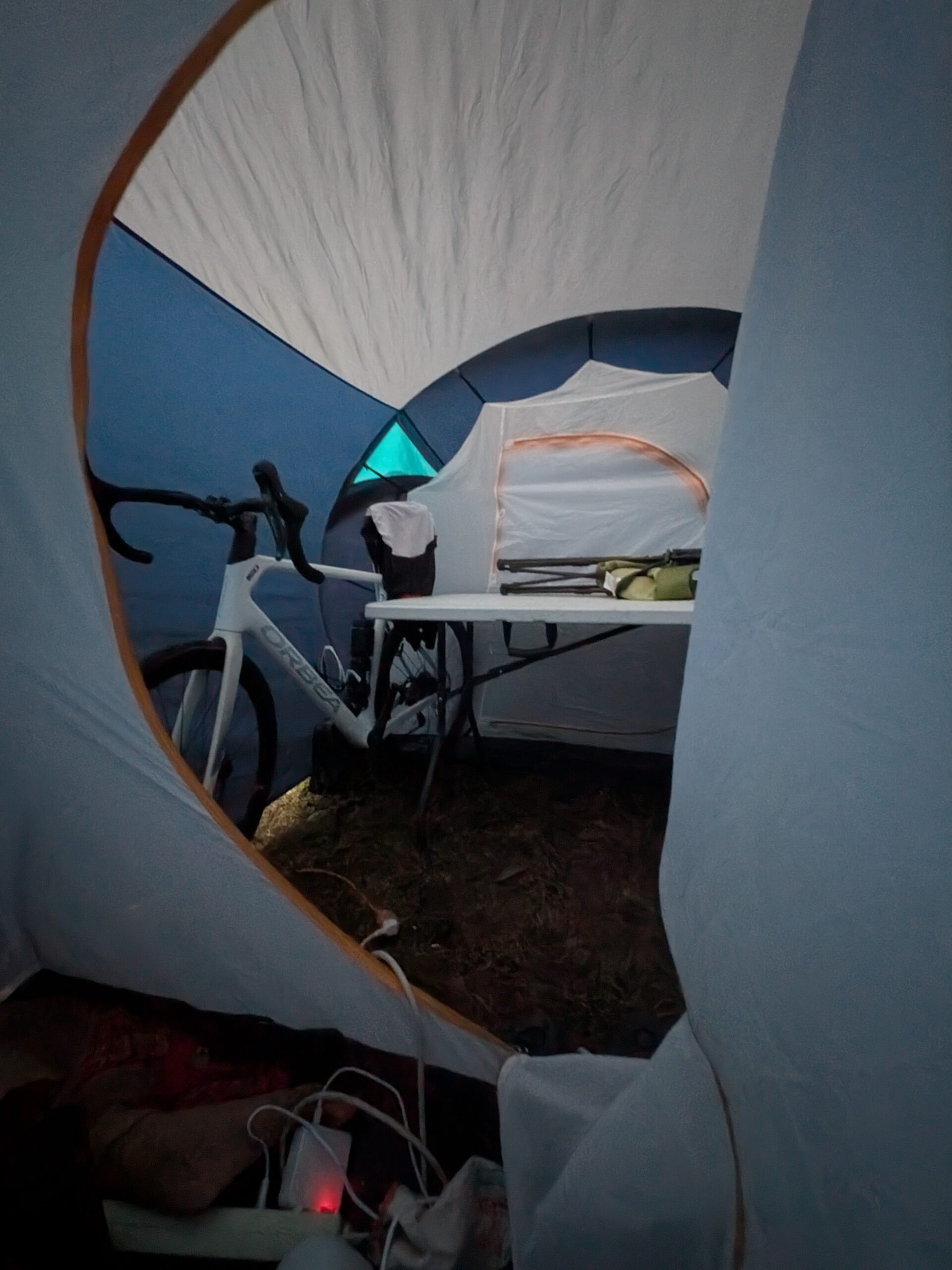 Je récupère ma caisse et entre dans la tente pour me changer. Vu les conditions, j’ai fait le choix de me changer entièrement. J’étais parti avec une tenue pure course a pieds et je dois enfiler une tenue de vélo. Tout ca avec des vêtements, des mains, un corps trempé et froids. Je perds du temps et voit les autres concurrents me passer devant. Je l’accepte douloureusement mais j’ai besoin de confort pour le vélo. Je dois passer presque 5 minutes a enfiler le k-way et les mitaines qui me collent sur la peau. Je range mes vêtements dans la caisse en les réemballant dans un sac poubelle, une partie du matériel resservira après le vélo. J’ai déjà froid aux pieds en pensant aux chaussures que je devrais rechausser dans quelques heures. Je prends le vélo et cours jusqu’à la sortie du parc. Il pleut toujours.