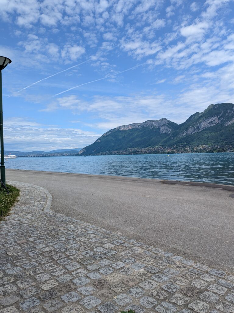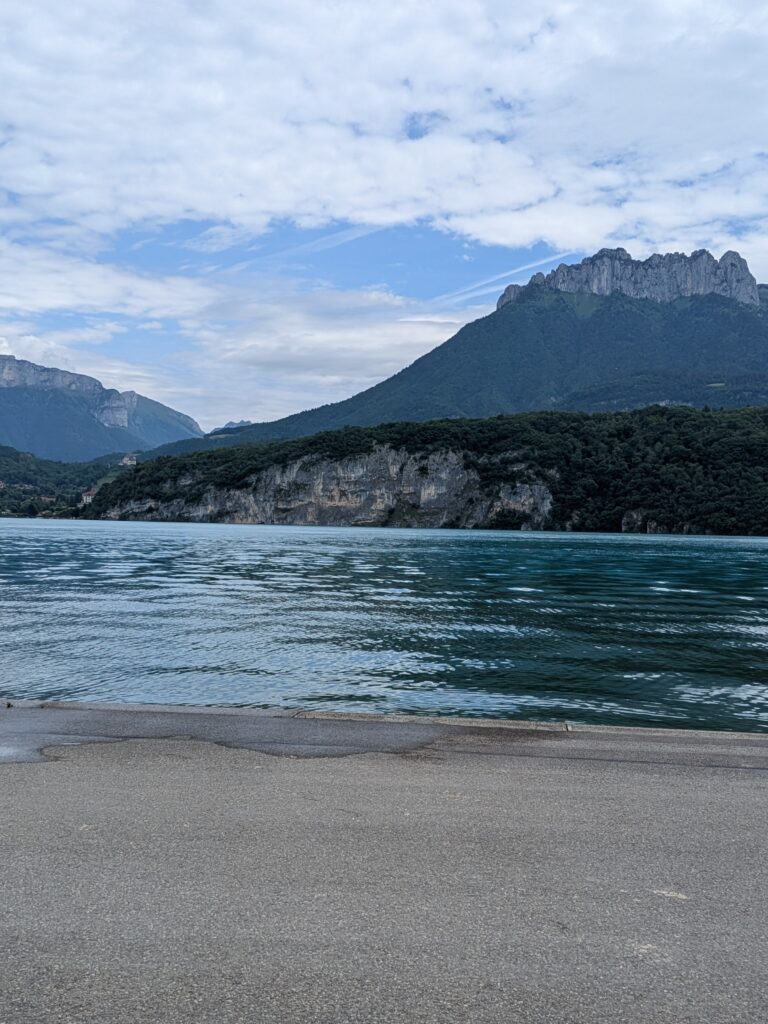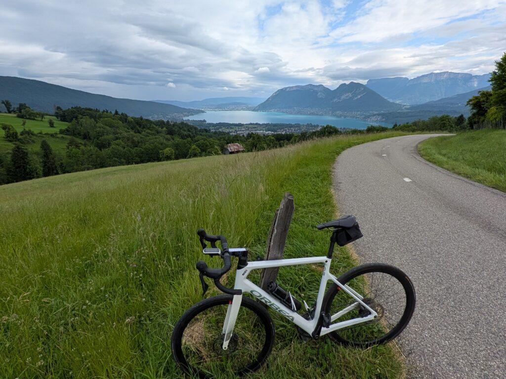 Le vendredi matin, je fais une petite sortie vélo pour repérer les premiers kilomètres de la course et le début de la montée. Je grimpe en admirant le paysage . Plus je monte, plus la vue sur le lac est belle. Il fait à peu près beau et je profite. Je m’amuse aussi pendant la redescente.