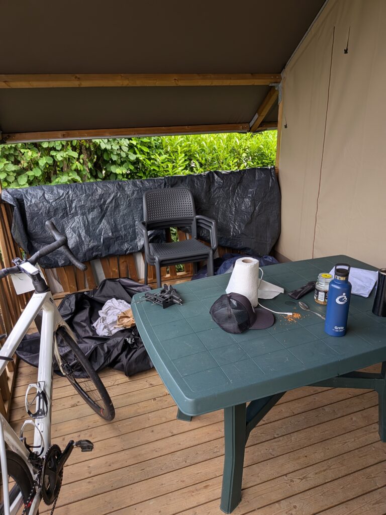 Cette année, je loge en camping, et en tente. J’arrive dans le camping que j’ai réservé et monte la tente, il fait assez beau. Ca fait une semaine que je regarde la météo 10 fois par jour. C’est un peu changeant, mais je reste assez confiant. Je fais un petit tour de vélo jusqu’au lac, pour vérifier que je l’ai bien remonté après le voyage. Ca roule bien, j’ai des bonnes jambes mais je me retiens pour éviter de trop me dépenser. Première nuit en tente, je dors moyennement bien. Mon emplacement est proche de la route et il y a un peu de bruit. Pas de souci de température ni de confort. Je supporte encore le matelas pneumatique malgré mon âge !