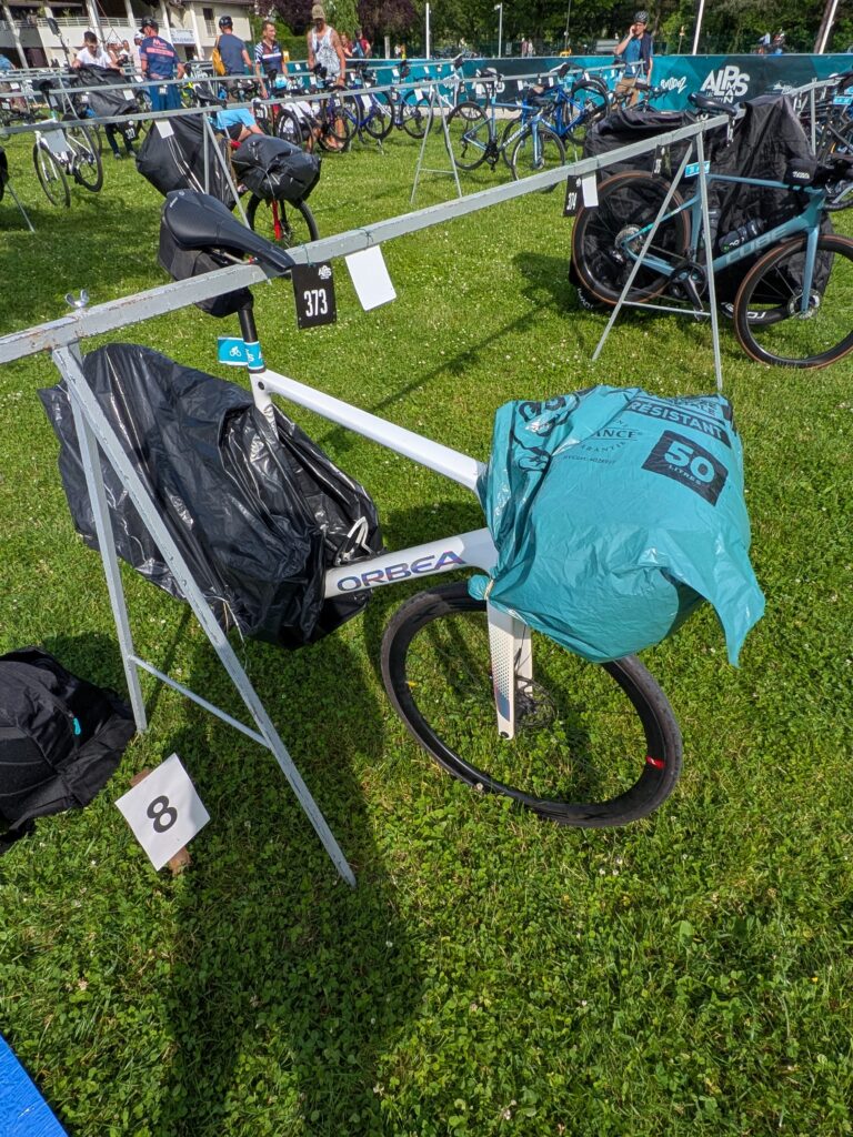 Avec un départ prévu très tôt, il est indispensable de déposer la veille le vélo, les sacs de ravitaillement et de matériel de rechange pour des checkpoints disposés sur le parcours. Je pars donc avec mon vélo et mes sacs à laisser aux organisateurs jusqu’au village de course. Je dépose mon sac de ravitaillement de mi-parcours vélo et mon vélo dans le parc que j’emmaillote dans des sacs poubelles pour éviter qu’il ne prenne trop d’eau pendant la nuit. Je pars ensuite au briefing